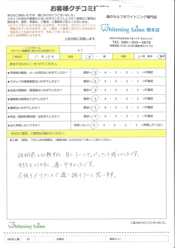施術前と比較すると、白くトーンアップしていて嬉しくかったです。